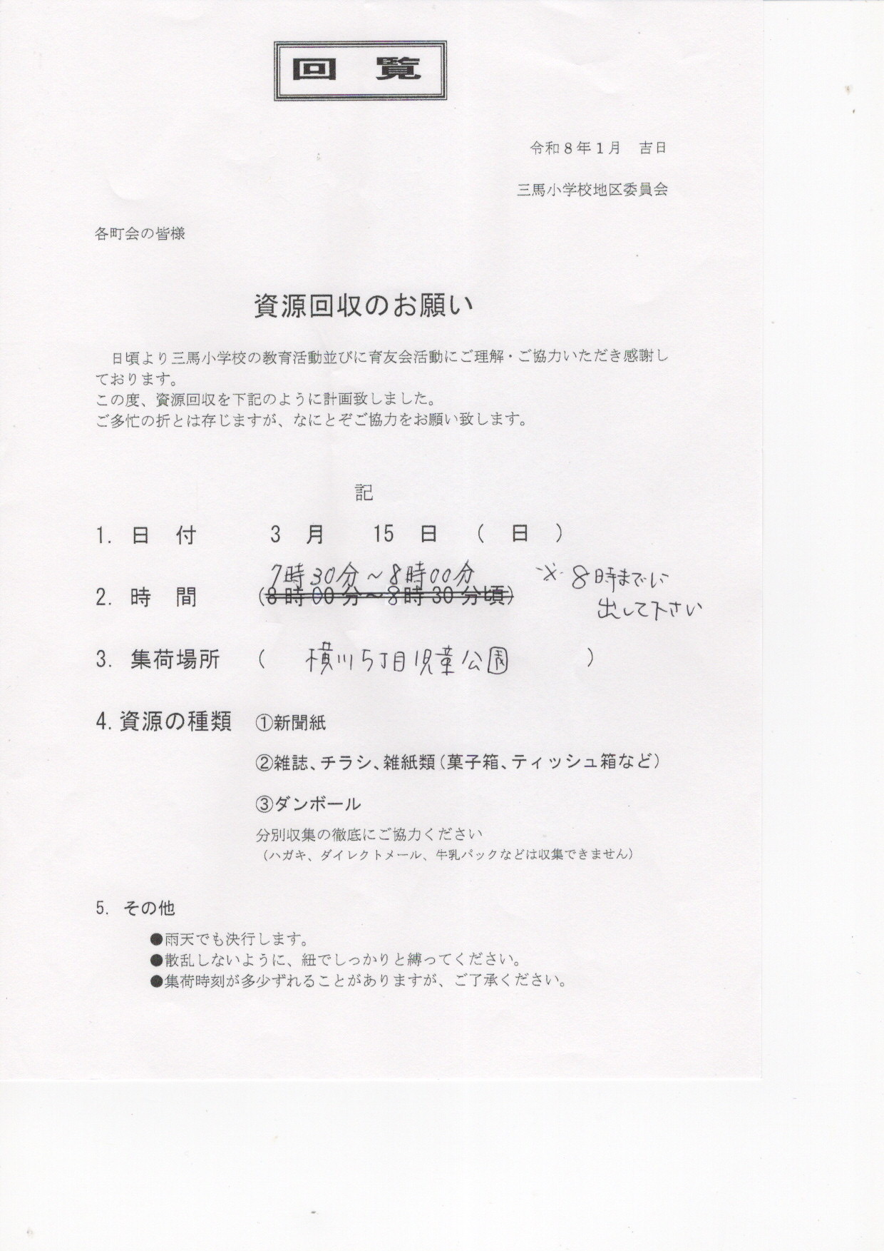 投稿日: 2026年2月17日2026年2月17日【案内】3月資源回収について 三馬小学校地区委員会より資源回収の案内がありました。 1.日 付 3月15日(日) 2.時 間 7時30分 ~ 8時00分 3.集荷場所 横川5丁目児童公園 玄関先へ出す場合、8時00分までにお願いします。 ※雨天でも決行します。 詳しくは、回覧文書を参照ください。