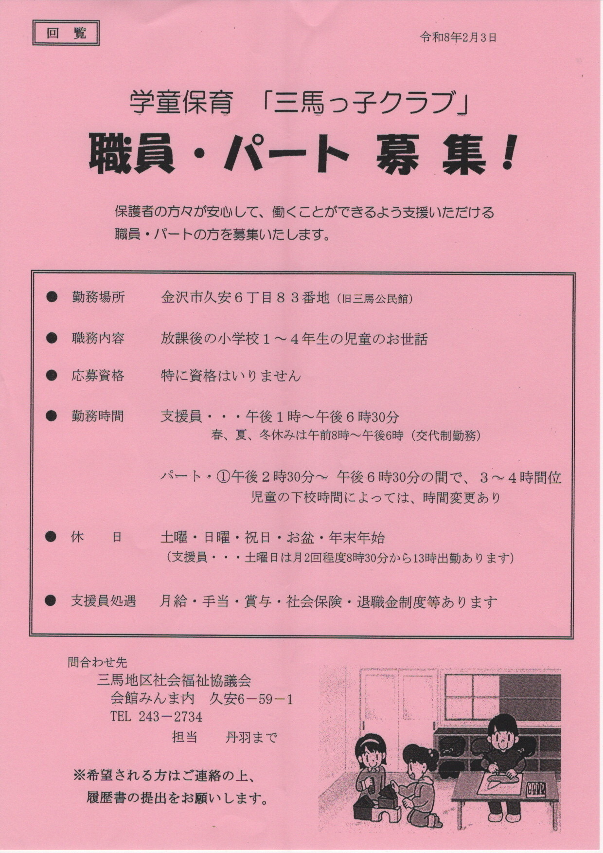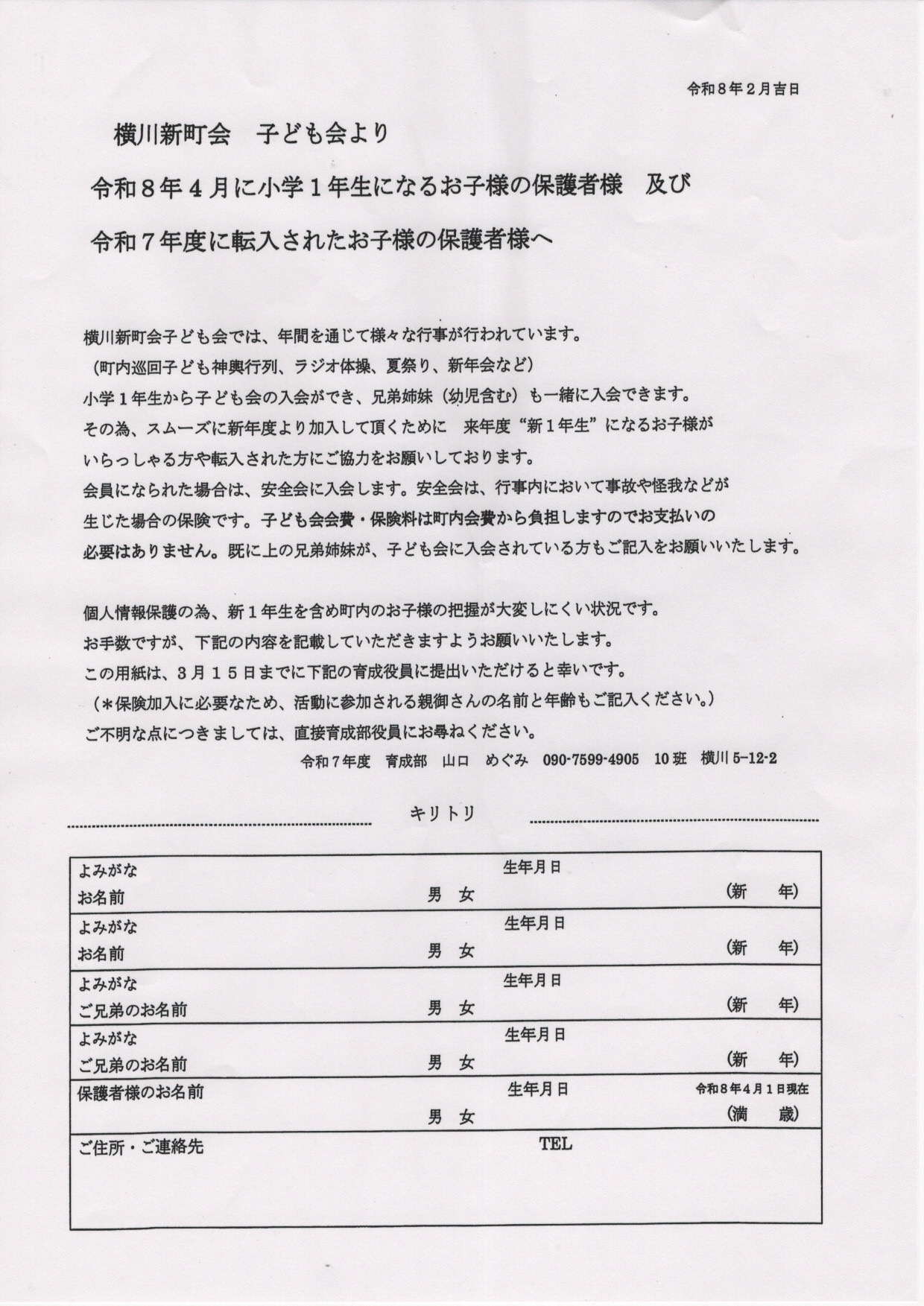 投稿日: 2026年2月17日2026年2月17日【案内】新小学1年生について 育成部より令和8年4月に小学1年生になられるお子様の保護者様、および、令和7年度に転入されたお子様様に向けた案内がありました。 詳しくは、回覧文書を参照ください。