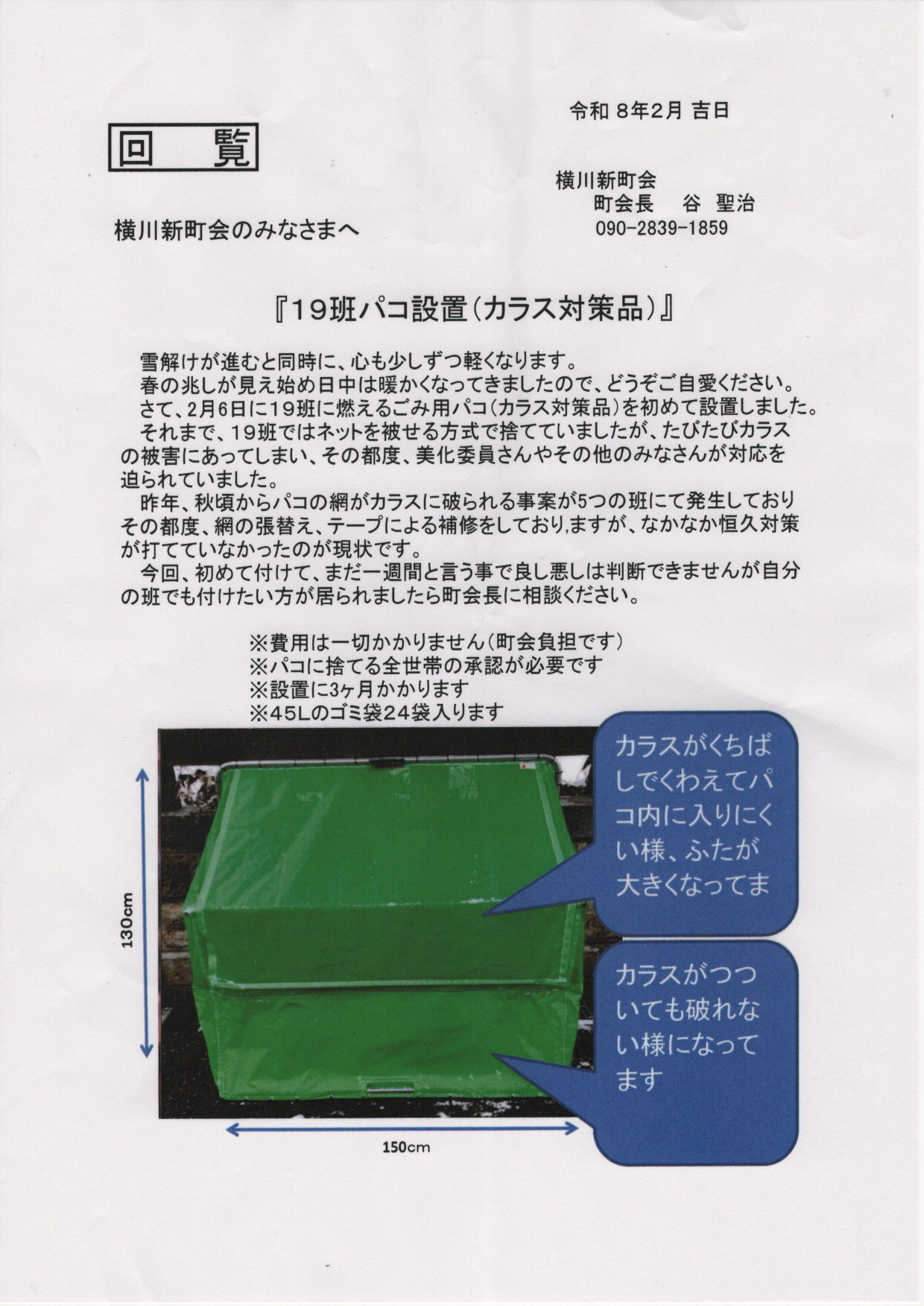 投稿日: 2026年2月17日2026年2月17日【案内】ゴミパコ設置(カラス対策品)について 「19班パコ設置(カラス対策品)」の案内がありました。 詳しくは、回覧文書を参照ください※件名以外の案内を含みます。