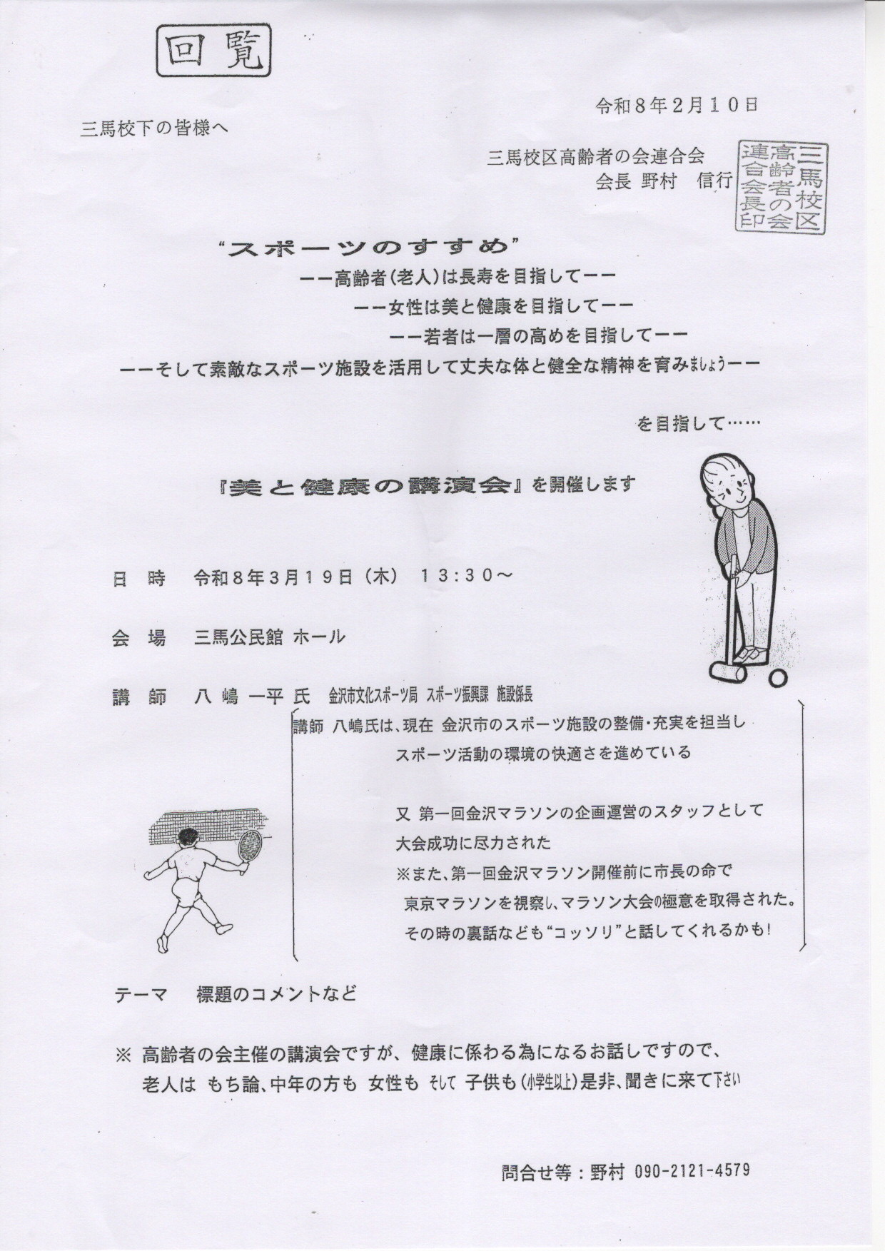 投稿日: 2026年1月19日2026年1月19日【案内】スカットボール大会のご案内について 長寿会、および、三馬校区高齢者の会連合会よりスカットボール大会の開催について案内がありました。 詳しくは、回覧文書を参照ください。