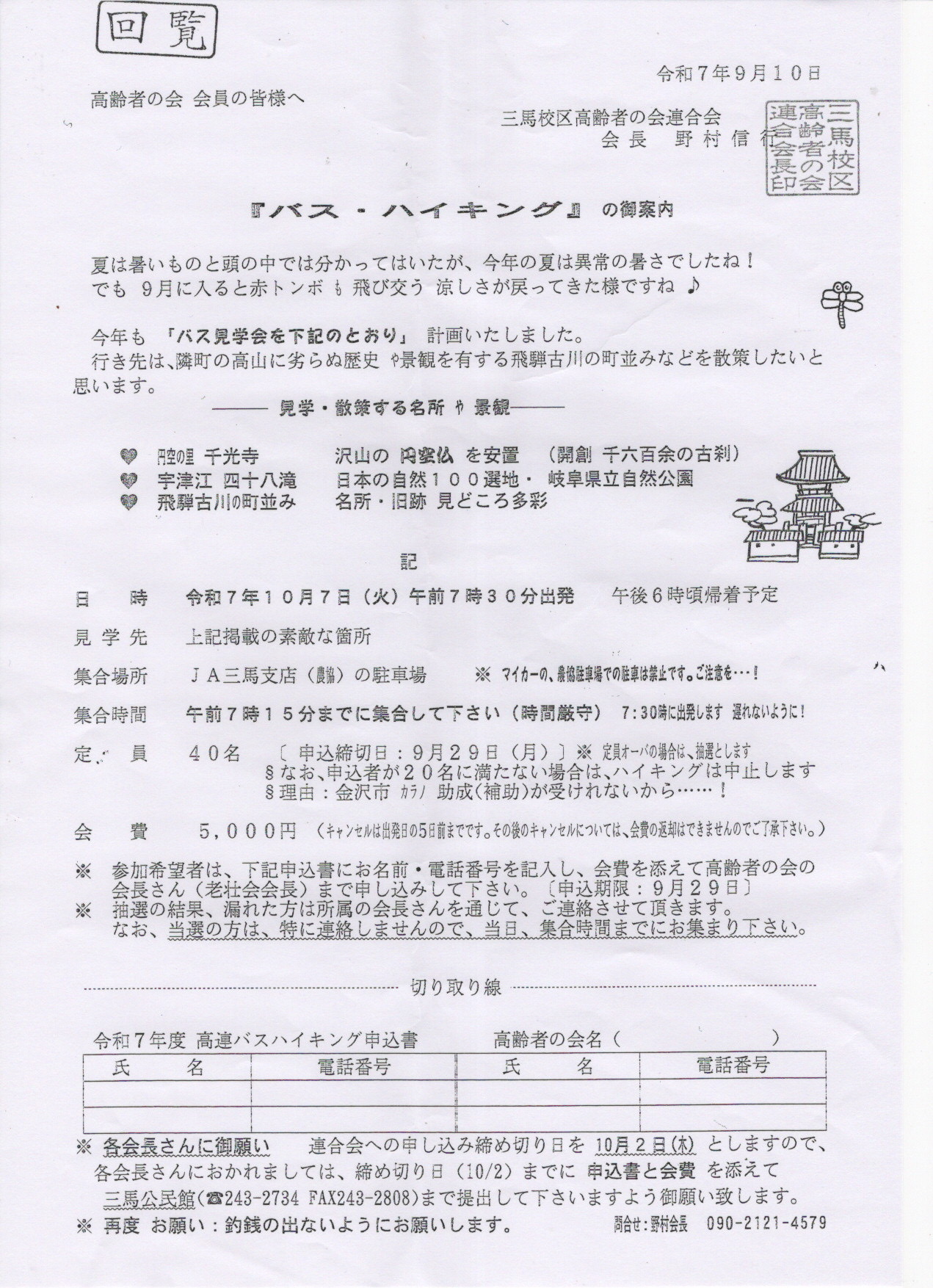 投稿日: 2025年9月27日2025年9月27日 投稿者: 管理者【案内】バス・ハイキングについて 長寿会より「バス・ハイキング」の案内がありました。 1.開催日 10月7日(火) 2.集 合 JA三馬支店の駐車場 午前7時30分出発 3.会 費 5,000円詳しくは、回覧文書を参照ください。※参加希望者は、申し込み必要です。